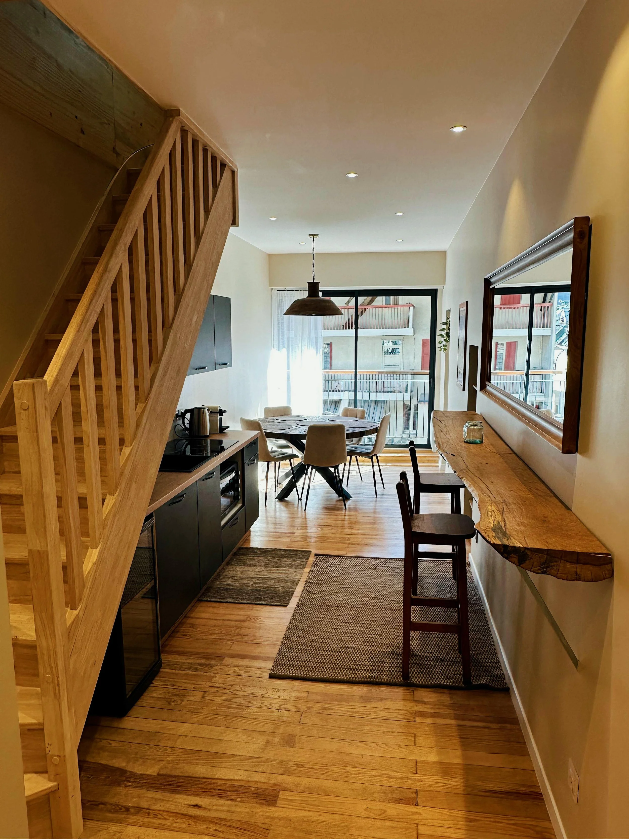 You enter the apartment straight into the dinning room with the open plan kitchen giving onto a wooden bartop and a large wooden dinning table lit up by sliding glass doors and views of alpe d’huez.
